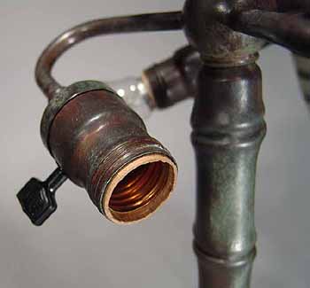 This base is wired according to US safety standards. It comes ready to use in the USA with new old style cloth covered lamp cord and standard US lamp sockets. Other standards of electrification are available at no extra cost. The suface of the lamp base and sockets are patinated with brown /dark green- brown Tiffany patina made in our Studio using the original recipe handed down by Tiffany Studios New York. No lacquer is used in the patination process.
