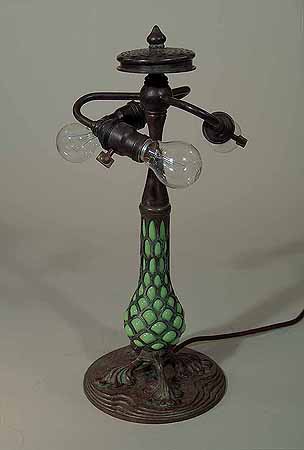 The suface of the lamp base and sockets are patinated with brown /dark green- brown Tiffany patina made in our Studio using the original recipe handed down by Tiffany Studios New York. No lacquer is used in the patination process.