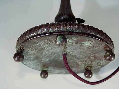Base is wired according to US safety standards. It comes ready to use in the USA with new old style cloth covered lamp cord and standard US lamp sockets. Other standards of electrification are available at no extra cost. The suface of the lamp base and sockets are patinated with brown /dark green- brown Tiffany patina made in our Studio using the original recipe handed down by Tiffany Studios New York. No lacquer is used in the patination process.